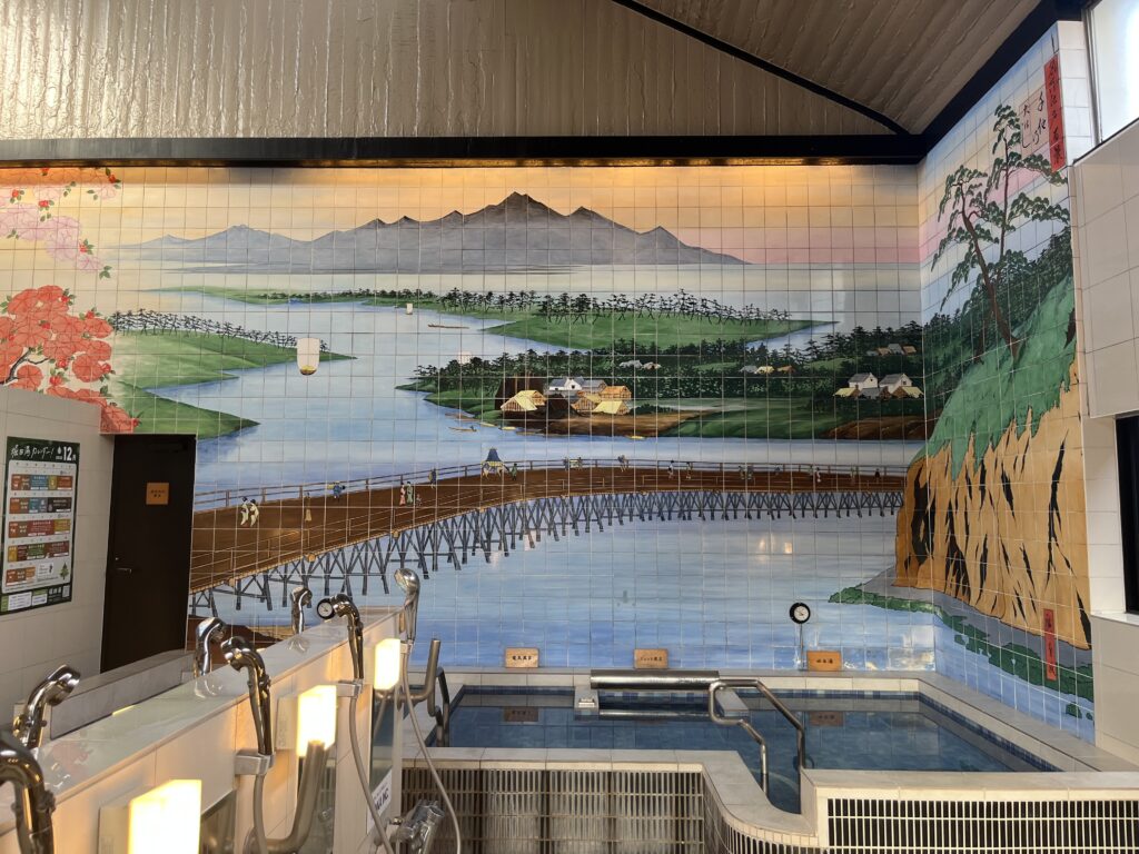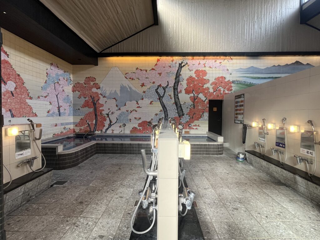 リニューアルされた銭湯でありながら、浴室の壁には桜と富士山のペンキ絵。