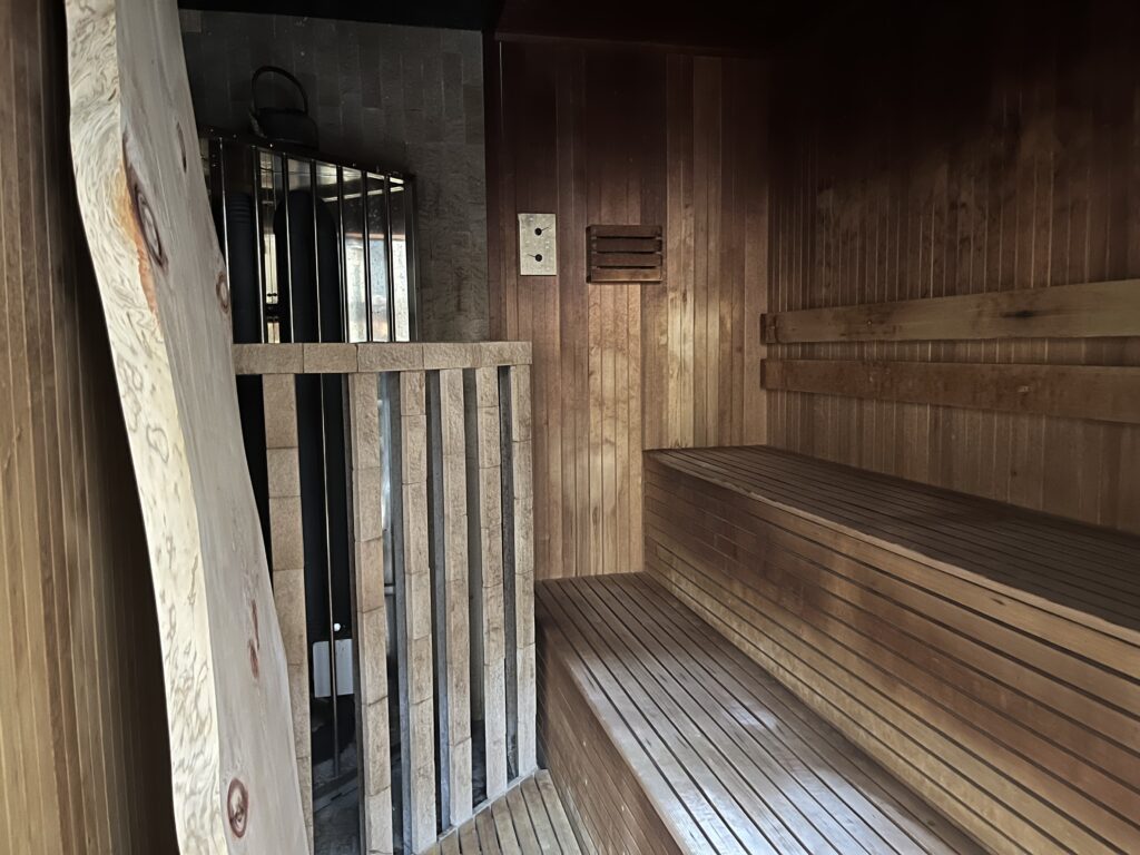サウナは6名ほどのコンパクトなサイズですが、遠赤外線ストーブで104℃
