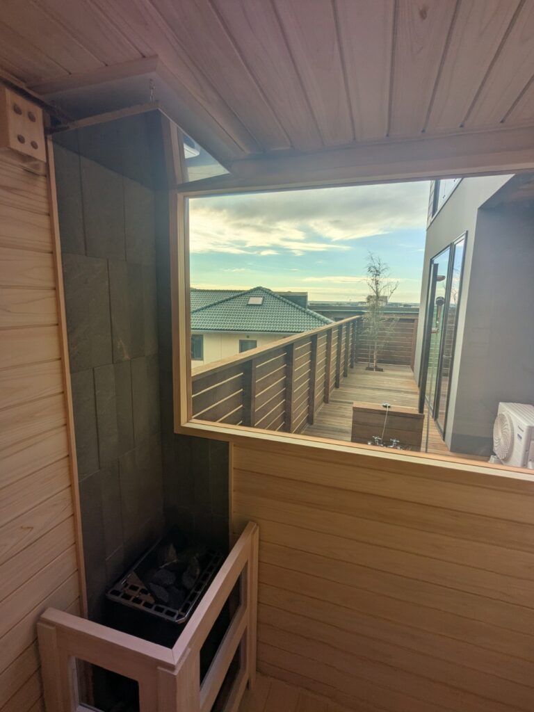 サウナの窓口として、“置けるかどうか”の段階から一緒に整理して、最終的に 3〜4人用のバレルサウナ(電気ストーブ)+陶器の丸形水風呂 という、最高に気持ちいい導線が完成しました。