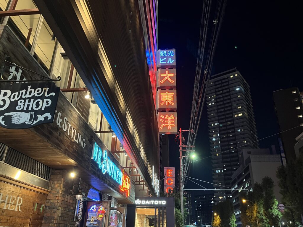 大東洋とネオンで光る建物。