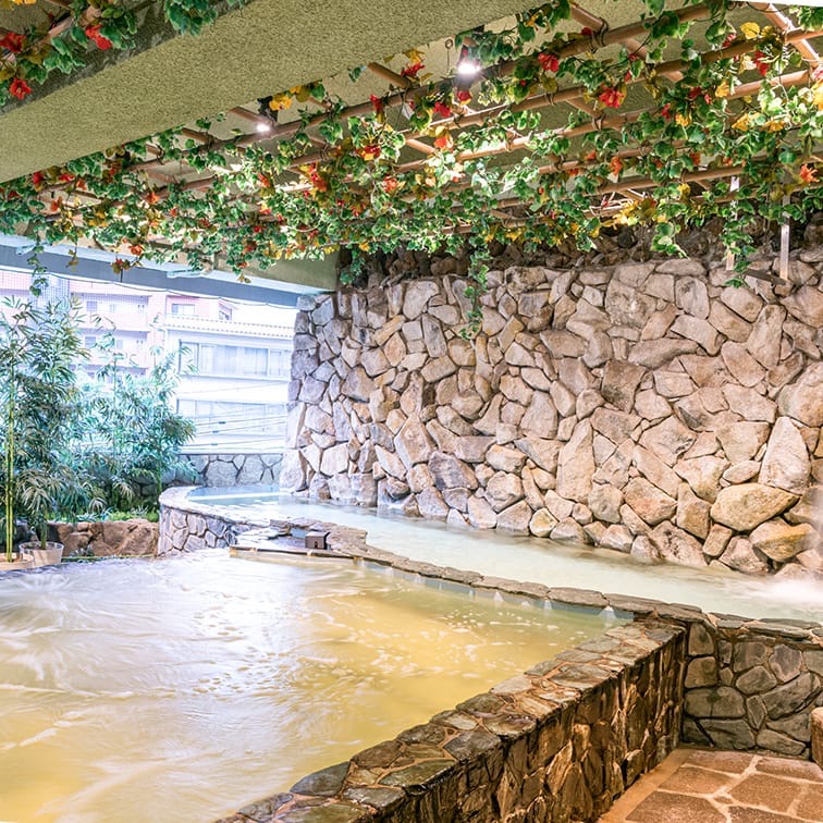 ジャグジー、薬湯、ジェットバス、打たせ湯、寝湯、露天風呂。