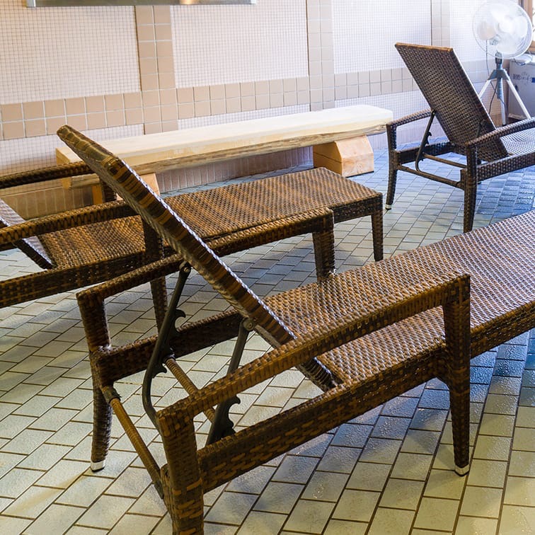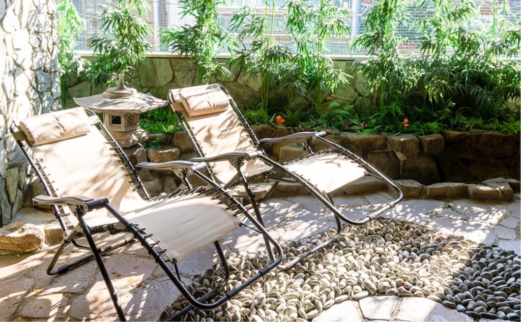 内気も外気も、ととのい椅子がたくさん置いてある。